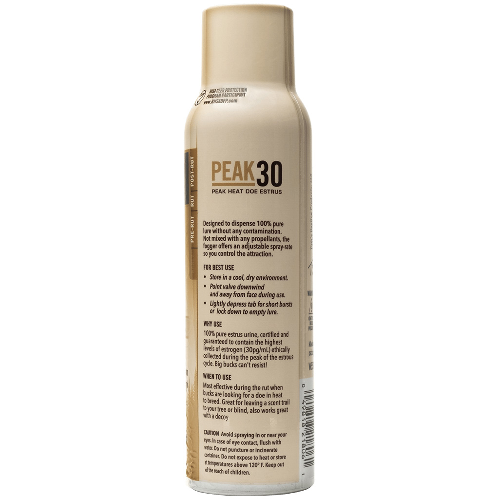 Tink’s PEAK30 Doe Estrus Fogger is a 5 oz lure designed for effective use during the rut. Containing 100% pure estrus urine with high estrogen, it dispenses a fine mist for a precise spread. The adjustable spray rate and contamination-free design ensure optimal attraction.